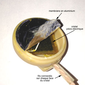 a source audio sont reliés sur chaque face du cristal piézo-électrique. Ce cristal a une forme carrée (1 cm x 1 cm environ) et plate (épaisseur de l’ordre du millimètre). Chaque face est métallisée sur presque toute sa surface. Les fils sont connectés aux parties métallisées. Si l’on frappe (légèrement) la pointe fixée au centre de ce cristal, on produit une tension que l’on peut recueillir sur les faces métallisées car l’effet piézo-électrique est réversible. La pastille piézo-électrique est reliée mécaniquement à une membrane conique en aluminium par une pointe fixée au centre du dispositif. La membrane en aluminium est collée sur son contour au boîtier en plastique (rose-orange). Un couvercle avec une partie s’emboitant dans l’oreille est collé sur la partie fixe.